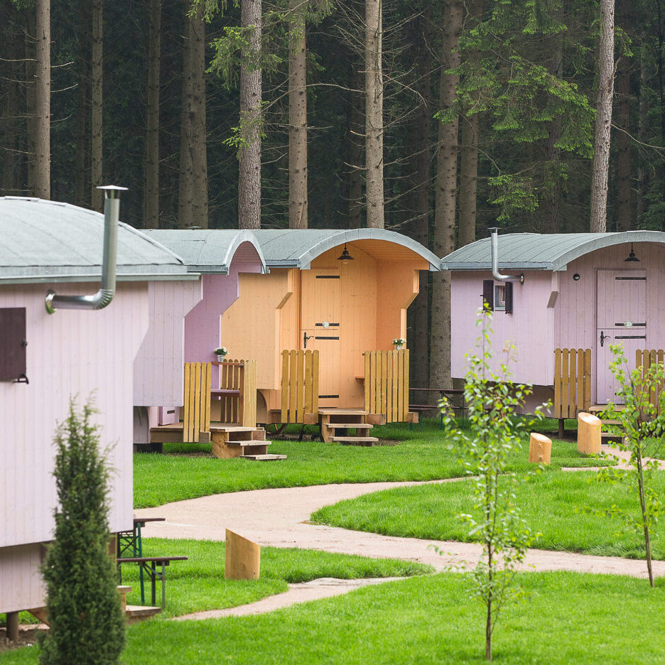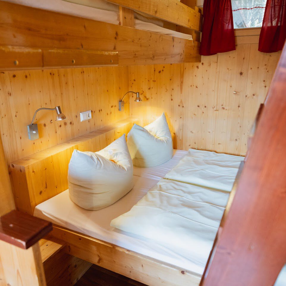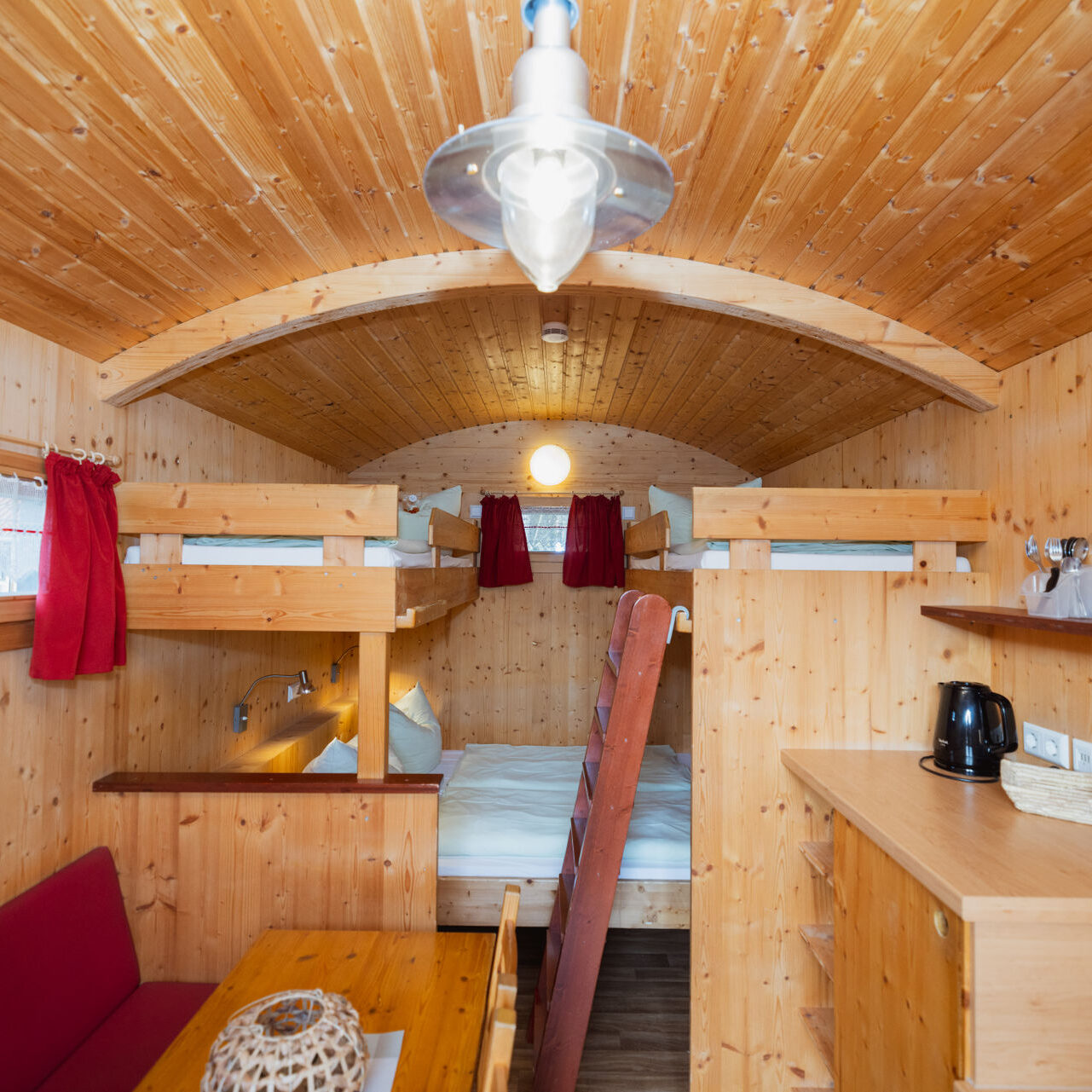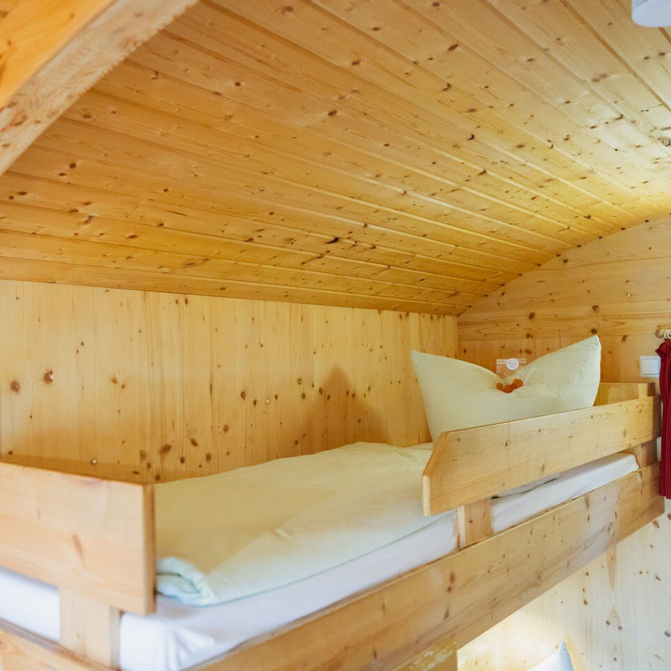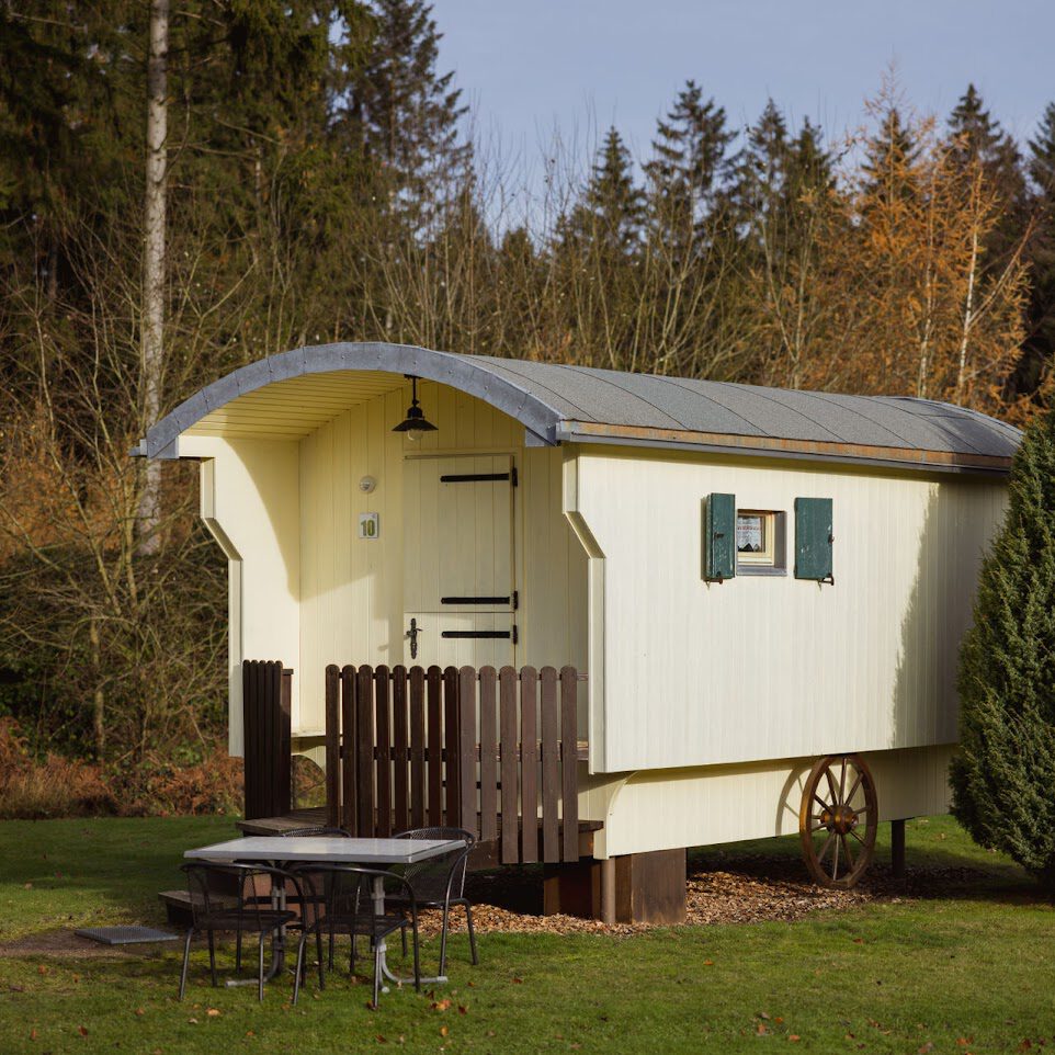 In unseren Schäferwagen haben bis zu fünf Personen Platz. Die Wagen sind mit einem Doppelbett und zwei Hochbetten ausgestattet. Nach Bedarf kann eine weitere Polsterliege ausgeklappt werden. Das kleine Raumwunder verfügt über Sitzmöglichkeiten, einen Kühlschrank, einen Wasserkocher, Geschirr, einen Heizkörper sowie einen Fernseher. In unmittelbarer Nähe zu den Schäferwagen befindet sich ein Waschhaus mit WCs, Duschen und Waschbecken.