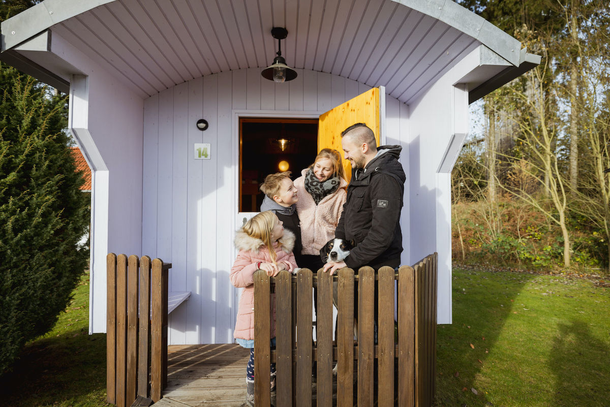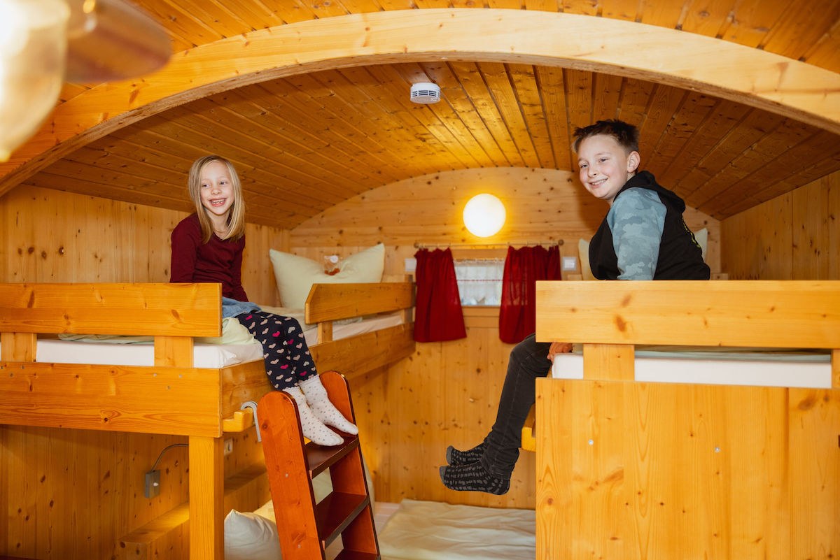 In unseren Schäferwagen haben bis zu fünf Personen Platz. Die Wagen sind mit einem Doppelbett und zwei Hochbetten ausgestattet. Nach Bedarf kann eine weitere Polsterliege ausgeklappt werden. Das kleine Raumwunder verfügt über Sitzmöglichkeiten, einen Kühlschrank, einen Wasserkocher, Geschirr, einen Heizkörper sowie einen Fernseher. In unmittelbarer Nähe zu den Schäferwagen befindet sich ein Waschhaus mit WCs, Duschen und Waschbecken.